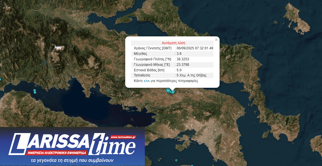 Σεισμός μεγέθους 3,6 βαθμών της κλίμακας Ρίχτερ σημειώθηκε το πρωί του Σαββάτου 6/9. Σύμφωνα με την αυτόματη λύση του Γεωδυναμικού Ινστιτούτου, το επίκεντρο της σεισμικής δόνησης ήταν 5 χιλιόμετρα ανατολικά της Θήβας, ενώ το εστιακό βάθος υπολογίζεται σε 5 χιλιόμετρα.