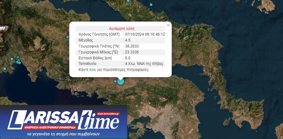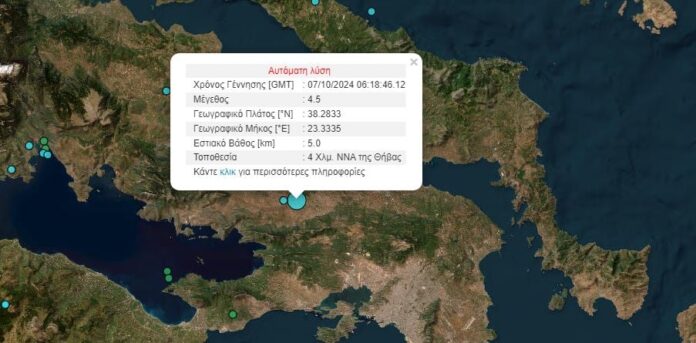 Σεισμός έγινε πριν από λίγο στην Θήβα. Ο σεισμός είχε μέγεθος 4,5 Ρίχτερ σύμφωνα με την Αυτόματη Λύση του Γεωδυναμικού Ινστιτούτου Αθηνών και έγινε αισθητός και στην Αττική.