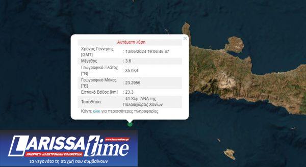 Η χρονικώς τελευταία δόνηση, η οποία είχε μέγεθος 3,9 βαθμών στην κλίμακα Ρίχτερ κι έλαβε χώρα στις 22:06, σημειώθηκε σαράντα χιλιόμετρα δυτικά-νοτιοδυτικά της Παλαιοχώρας Χανίων.