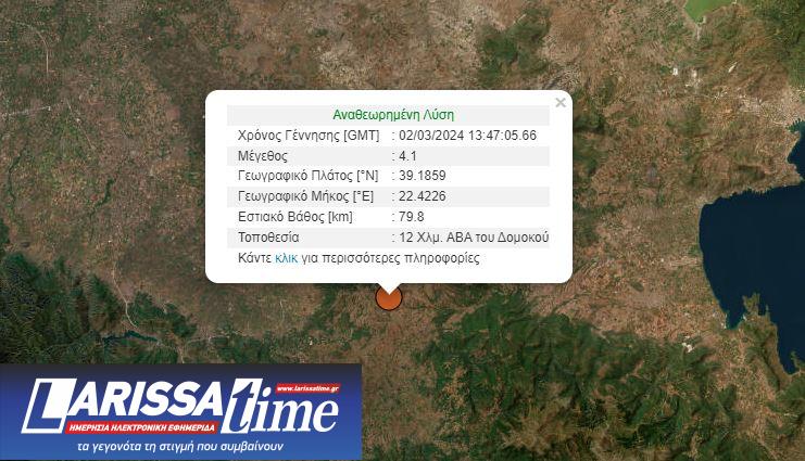 Το επίκεντρο της δόνησης εντοπίζεται 12 χλμ. ΑΒΑ του Δομοκού. Εστιακό βάθος: 79,8.