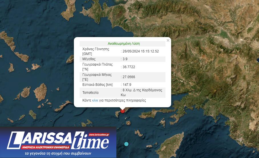 Σύμφωνα με το Γεωδυναμικό Ινστιτούτο, το μέγεθος της δόνησης είναι 3,9 Ρίχτερ ενώ το επίκεντρο εντοπίζεται 8 χιλιόμετρα Δυτικά των Καρδάμαινων.
