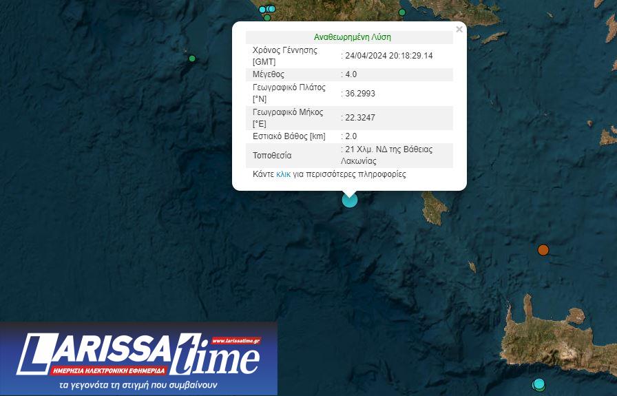 Σεισμική δόνηση μεγέθους 4 βαθμών της κλίμακας Ρίχτερ σημειώθηκε το βράδυ της Τετάρτης (24/4) στη θαλάσσια περιοχή νότια από το Γύθειο, στη Λακωνία.
