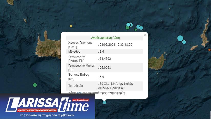 Σύμφωνα με το Γεωδυναμικό Ινστιτούτο, το μέγεθος της δόνησης είναι 3,6 Ρίχτερ ενώ το επίκεντρο εντοπίζεται 59 χιλιόμετρα νότια νοτιοανατολικά του Ηρακλείου.