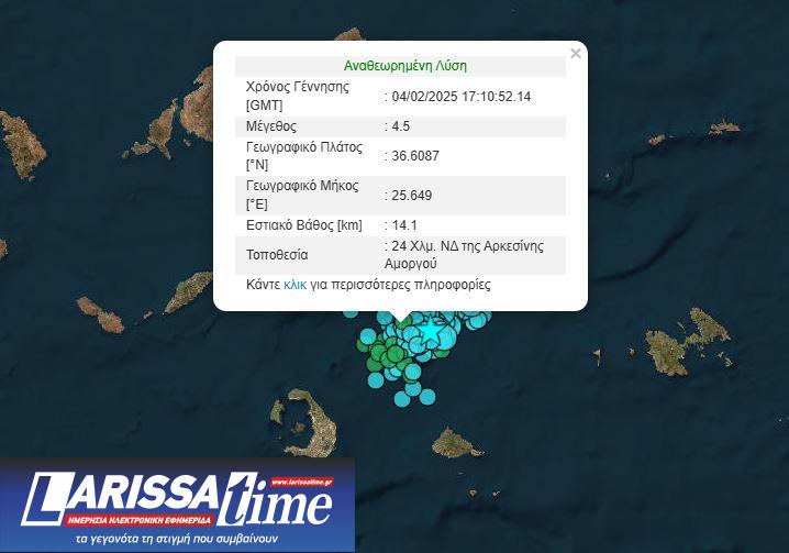 Ο νέος σεισμός στις Κυκλάδες είχε εστιακό βάθος 14,1 χλμ. και σημειώθηκε 24 χλμ. νοτιοδυτικά της Αρκεσίνης Αμοργού.