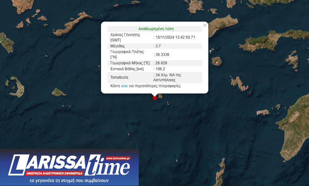 Σεισμός μεγέθους 3,7 βαθμών της Κλίμακας Ρίχτερ σημειώθηκε 34 χιλιόμετρα νοτιοανατολικά της Αστυπάλαιας στις 15:42 το μεσημέρι της Παρασκευής (15/11).