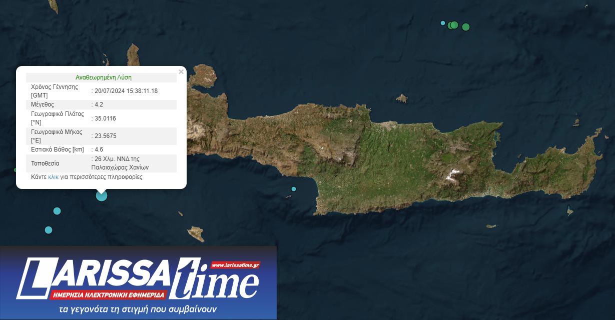 Το επίκεντρο εντοπίστηκε στη θαλάσσια περιοχή στα 26 χιλιόμετρα νότια – νοτιοδυτικά της Παλαιοχώρας Χανίων.