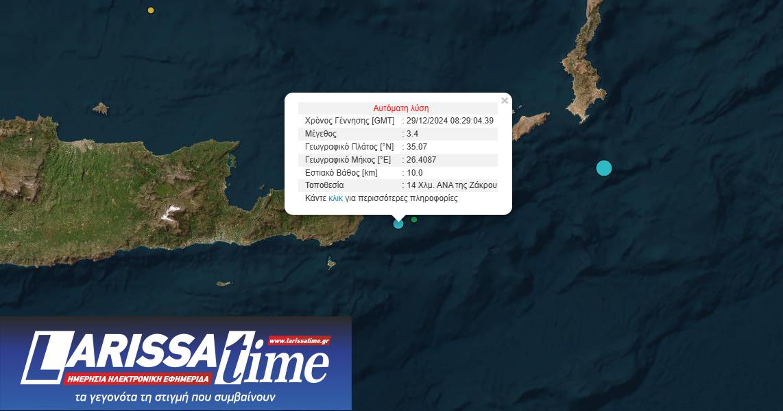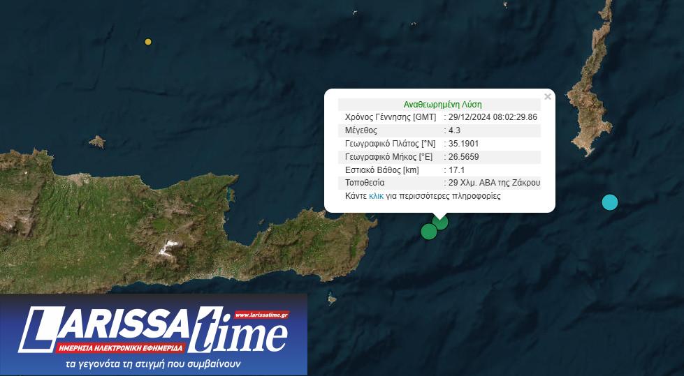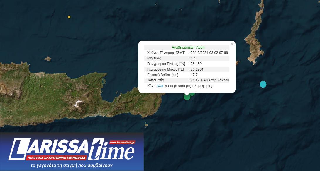 Σεισμός μεγέθους 4,4 Ρίχτερ σημειώθηκε στις 10:02 το πρωί ανοιχτά της Κρήτης, με επίκεντρο 24 χιλιόμετρα Ανατολικά Βορειοανατολικά της Ζάκρου και εστιακό βάθος 17,7 χιλιόμετρα σύμφωνα με την αναθεωρημένη λύση του Γεωδυναμικού Ινστιτούτου.