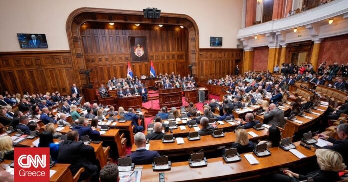 Οι βουλευτές της αντιπολίτευσης με την έναρξη της συνεδρίασης σήκωσαν πλακάτ όπου απεικονίζονται ματωμένα χέρια ενώ φώναζαν «Δολοφόνοι, δολοφόνοι». Η αντιπολίτευση θεωρεί υπεύθυνη την κυβέρνηση για την κατάρρευση τμήματος της οροφής στο σιδηροδρομικό σταθμό του Νόβι Σαντ, την 1η Νοεμβρίου, όταν σκοτώθηκαν 15 άνθρωποι και δύο τραυματίστηκαν.
