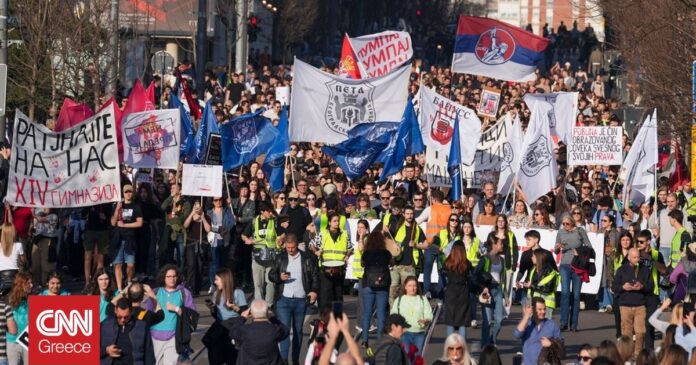Δεκάδες χιλιάδες φοιτητές, μαθητές και πολίτες πραγματοποίησαν σήμερα Παρασκευή (7/3) πορεία σε κεντρικούς δρόμους του Βελιγραδίου. Η πορεία αποτέλεσε το αποκορύφωμα των σημερινών κινητοποιήσεων και της γενικής απεργίας που πραγματοποιήθηκε ύστερα από κάλεσμα των φοιτητών.