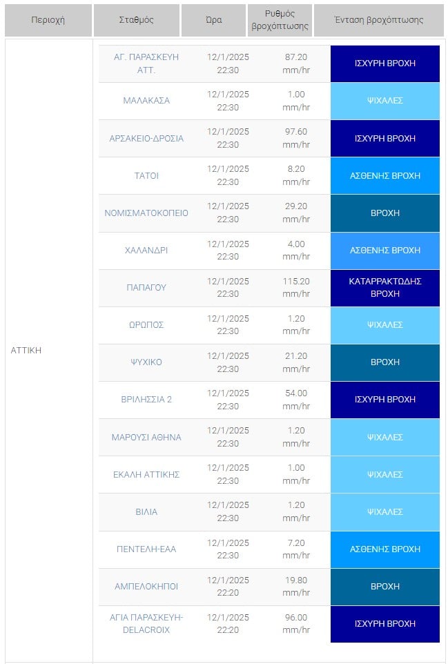 Σύμφωνα με πληροφορίες του meteo.gr, καταρρακτώδεις βροχοπτώσεις καταγράφηκαν σε περιοχές όπως η Αγία Παρασκευή, η Δροσιά, τα Βριλήσσια, το Ψυχικό και οι Αμπελόκηποι, ενώ στου Παπάγου τα φαινόμενα ήταν ιδιαίτερα έντονα.