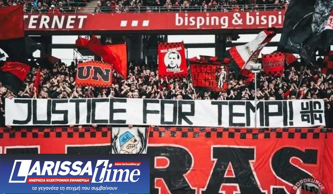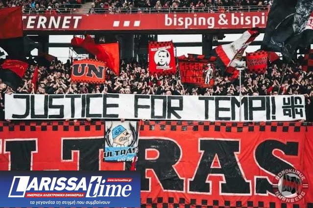 Οι φίλαθλοι της Νυρεμβέργης, Ultras Nurnberg, που είναι αδελφοποιημένοι με τους Monsters της ΑΕΛ, κατά την αναμέτρηση για τη Β’ Εθνική του Γερμανικού πρωταθλήματος, Νυρεμβέργη-Αννόβερο 1-2, που έγινε το Σάββατο (01/03) στο «Grundig Stadion», ύψωσαν πανό που έγραφε στα Αγγλικά: “Justice for Tempi” (Δικαιοσύνη για τα Τέμπη).