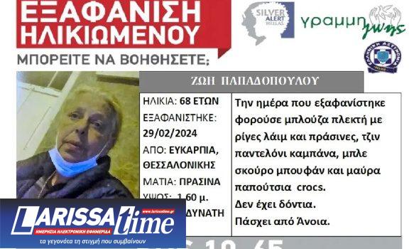 Συναγερμός έχει σημάνει στις Αρχές για την εξαφάνιση 68χρονης από την Ευκαρπία Θεσσαλονίκης. Η γυναίκα, που πάσχει από άνοια, έχει να δώσει σημεία ζωής από την Πέμπτη.