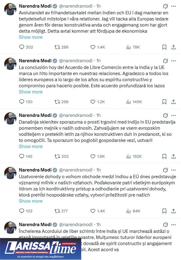 «Η σύναψη της Συμφωνίας Ελεύθερων Συναλλαγών Ινδίας-ΕΕ σήμερα σηματοδοτεί ένα σημαντικό ορόσημο στις σχέσεις μας» έγραψε χαρακτηριστικά στην ανάρτησή του.
