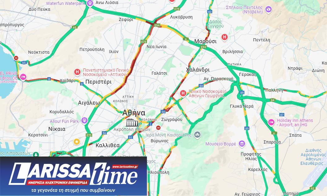 Στο «κόκκινο» βρίσκονται η έξοδος της Εθνικής Οδού Αθηνών – Κορίνθου και τα δύο ρεύματα της Αθηνών – Λαμίας, ενώ προβλήματα καταγράφονται στην Μεσογείων και την Κατεχάκη στο ρεύμα από Ηλιούπολη.