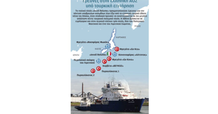 Με πρόσχημα την παραβίαση της τουρκικής υφαλοκρηπίδας, η Αγκυρα ανέπτυξε τα τελευταία 24ωρα έως και πέντε πολεμικά πλοία σε περιοχή η οποία βρίσκεται μόλις έξω από τα όρια της αιγιαλίτιδας ζώνης μεταξύ Κάσου και Καρπάθου, όπου πλέει τις τελευταίες ημέρες το υπό ιταλική σημαία πλοίο «Ievoli Relume», με σκοπό έρευνες για τη μελλοντική εγκατάσταση υποβρυχίων καλωδίων του έργου της ηλεκτρικής διασύνδεσης Κρήτης – Κύπρου (Great Sea Interconnector-GSI).