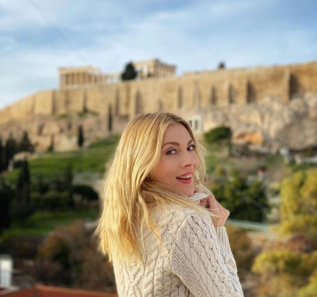 Με φόντο τη μαγευτική θέα της Ακρόπολης, η Σμαράγδα Καρύδη πόζαρε λαμπερή και χαμογελαστή, κρατώντας σαμπάνια στο χέρι.