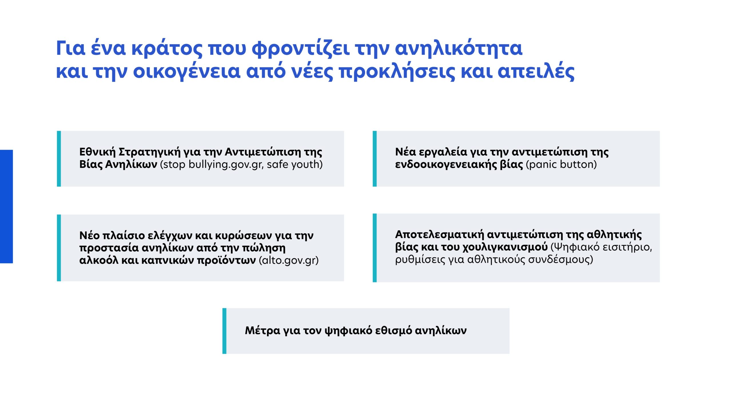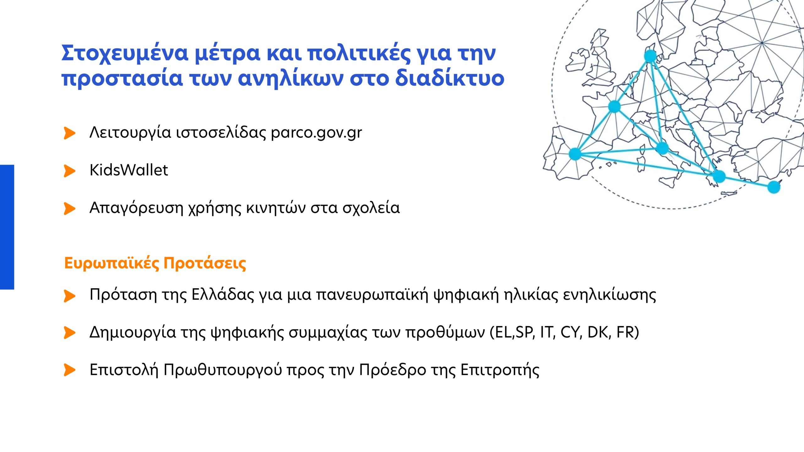 Ο Έλληνας Πρωθυπουργός επισήμανε πρώτος την ανάγκη προστασίας των ανηλίκων από τον εθισμό στο διαδίκτυο στη ΓΣ του ΟΗΕ τον Σεπτέμβριο του 2024. Από τότε, η Ελλάδα έχει προωθήσει μια σειρά από μέτρα σε ευρωπαϊκό και εθνικό επίπεδο μέσω μιας ολοκληρωμένης στρατηγικής για την προστασία των ανηλίκων από τον εθισμό στο διαδίκτυο. Το KidsWallet αποτέλεσε τον πρώτο λειτουργικό μηχανισμό επιβεβαίωσης ηλικίας που υιοθετήθηκε από κράτος-μέλος της ΕΕ, ενώ η πρόταση της Ελλάδας για τη θέσπιση μιας πανευρωπαϊκής ψηφιακής ηλικίας ενηλικίωσης υιοθετήθηκε πολιτικά από 13 κράτη-μέλη.
