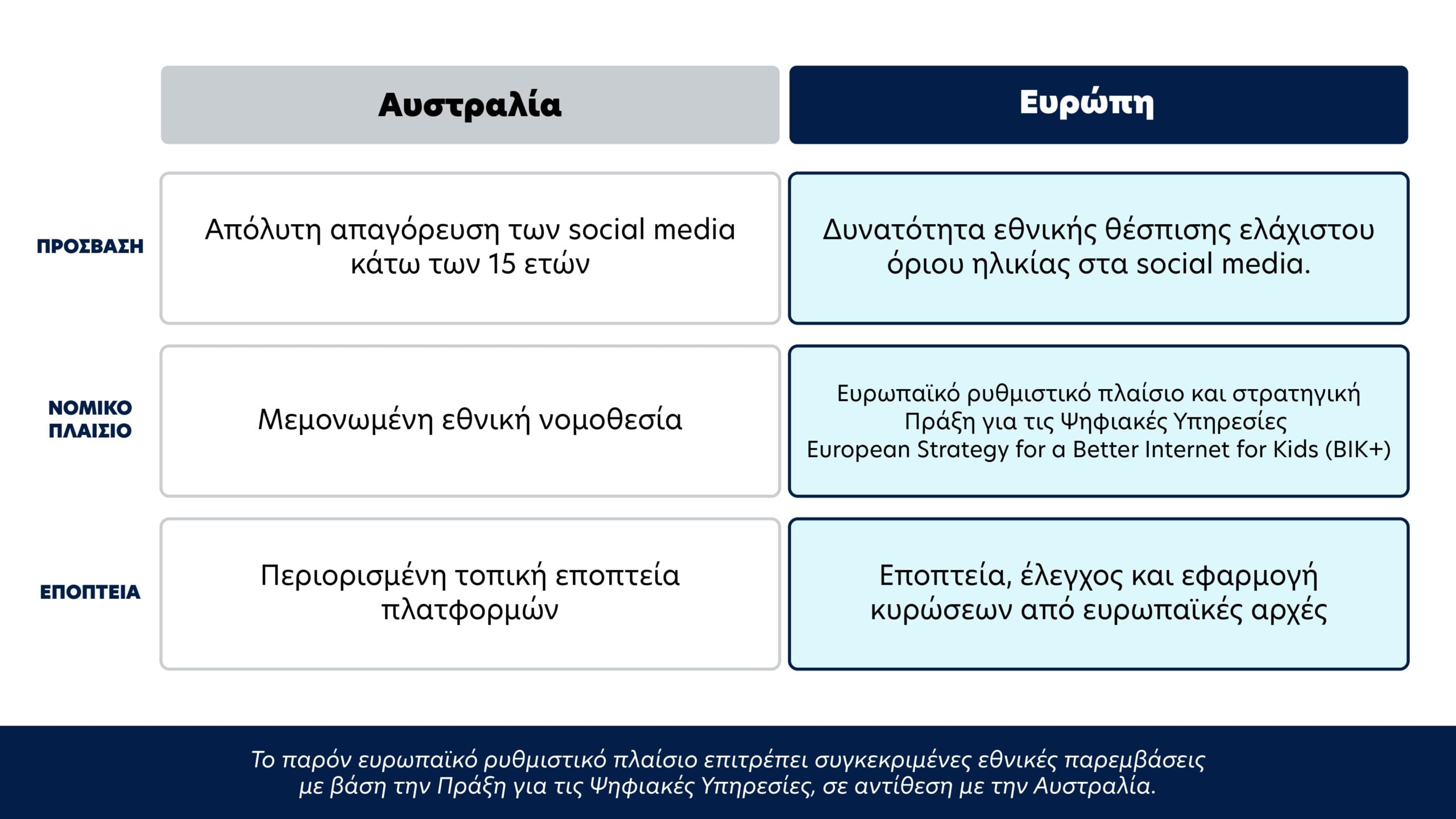 Σε αντίθεση με χώρες εκτός Ευρωπαϊκής Ένωσης, όπως η Αυστραλία, η Ελλάδα λειτουργεί εντός ενός κοινά συμφωνημένου ευρωπαϊκού κανονιστικού πλαισίου, το οποίο θέτει συγκεκριμένους κανόνες και διαδικασίες. Αν και ένα κράτος-μέλος μπορεί να θεσπίσει νομοθεσία που περιορίζει την πρόσβαση των ανηλίκων στα μέσα κοινωνικής δικτύωσης κάτω από ένα ορισμένο ηλικιακό όριο, η εφαρμογή, η εποπτεία και η επιβολή των κανόνων αυτών δεν είναι αποκλειστικά εθνική αρμοδιότητα.