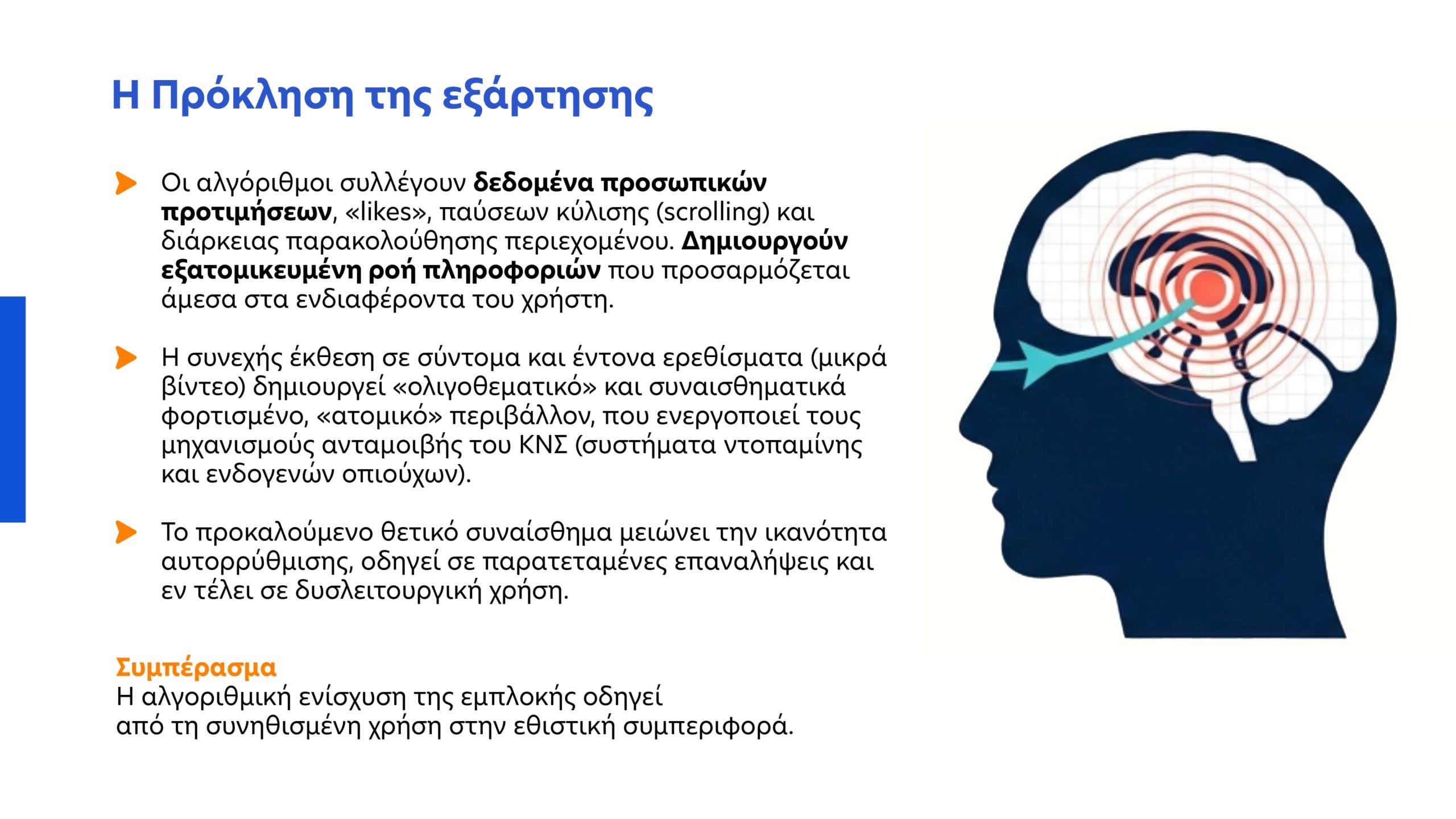 Παράλληλα, συγκεκριμένες ψηφιακές δραστηριότητες ενεργοποιούν στον εγκέφαλο τα ίδια «κυκλώματα ανταμοιβής» με αυτά των εξαρτησιογόνων ουσιών και μπορεί να οδηγήσουν σε απώλεια ελέγχου, έντονη επιθυμία και στερητικά συμπτώματα. Για αυτόν τον λόγο, οι επιστήμονες δεν λένε ότι το διαδίκτυο είναι ίδιο με τα ναρκωτικά, αλλά ότι σε ορισμένες ηλικίες μπορεί να λειτουργήσει με παρόμοιο τρόπο: επηρεάζει την αυτορρύθμιση, αντικαθιστά βασικές δραστηριότητες (ύπνο, άσκηση, επαφή με φίλους) και παρεμβαίνει σε μια περίοδο που ο εγκέφαλος ακόμα ωριμάζει. Έτσι, ο ψηφιακός εθισμός θεωρείται πλέον ζήτημα δημόσιας υγείας, αντίστοιχο ως προς τον αναπτυξιακό κίνδυνο με το αλκοόλ ή το κάπνισμα: όχι γιατί η ουσία είναι ίδια, αλλά γιατί η επίδραση στη συμπεριφορά, στη μάθηση και στην ψυχική υγεία των παιδιών μπορεί να είναι εξίσου βαθιά και μακροχρόνια.