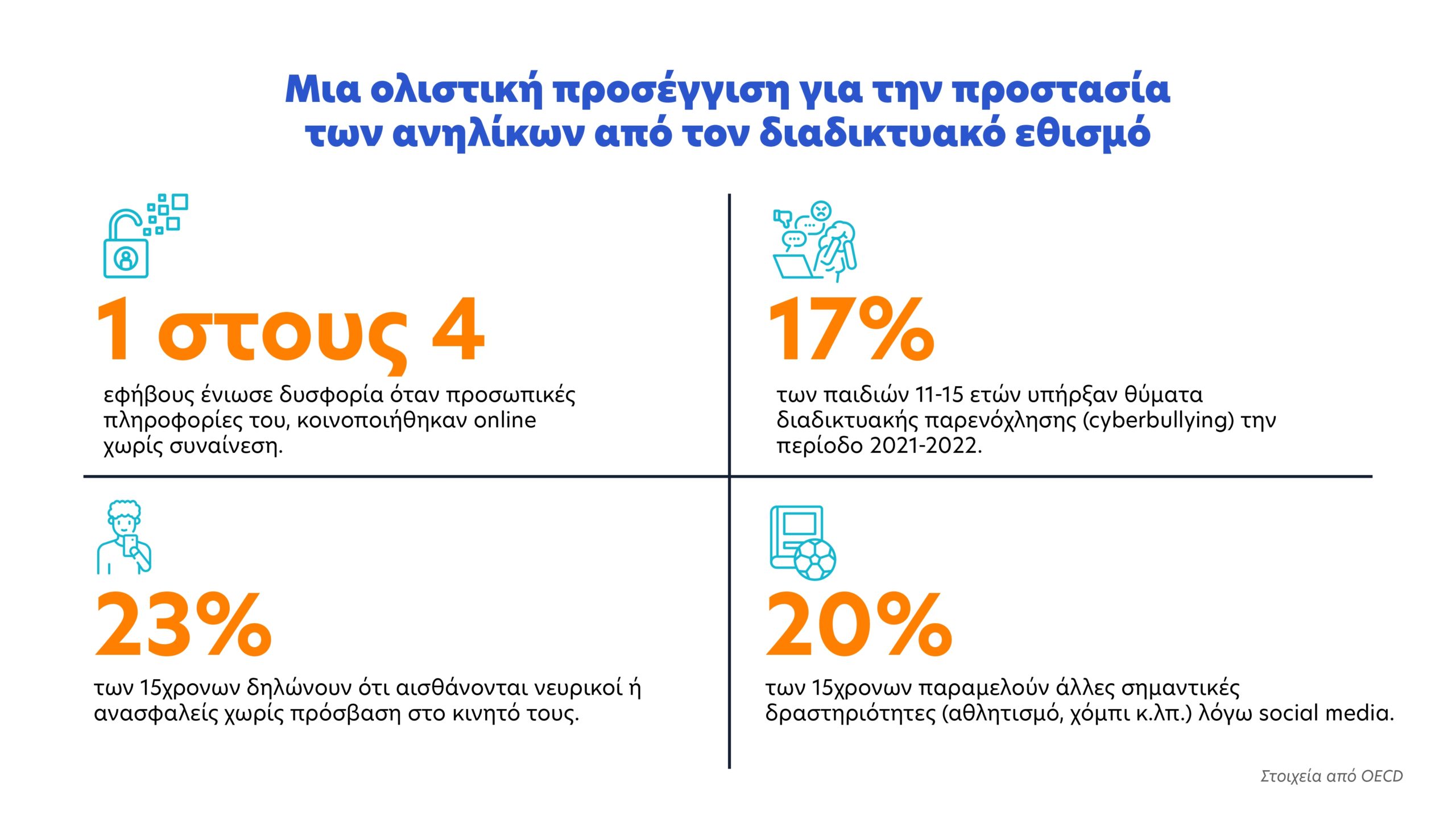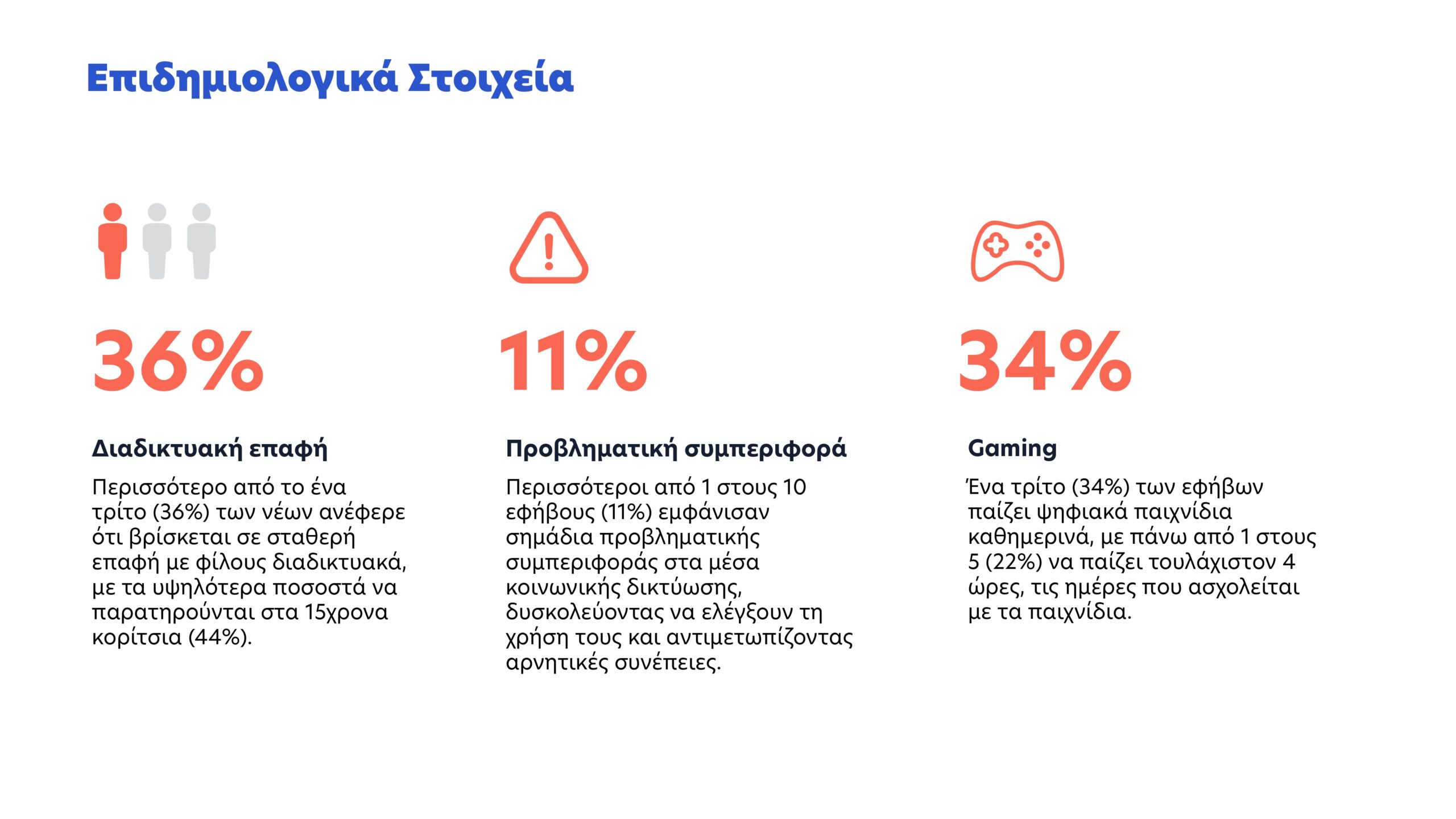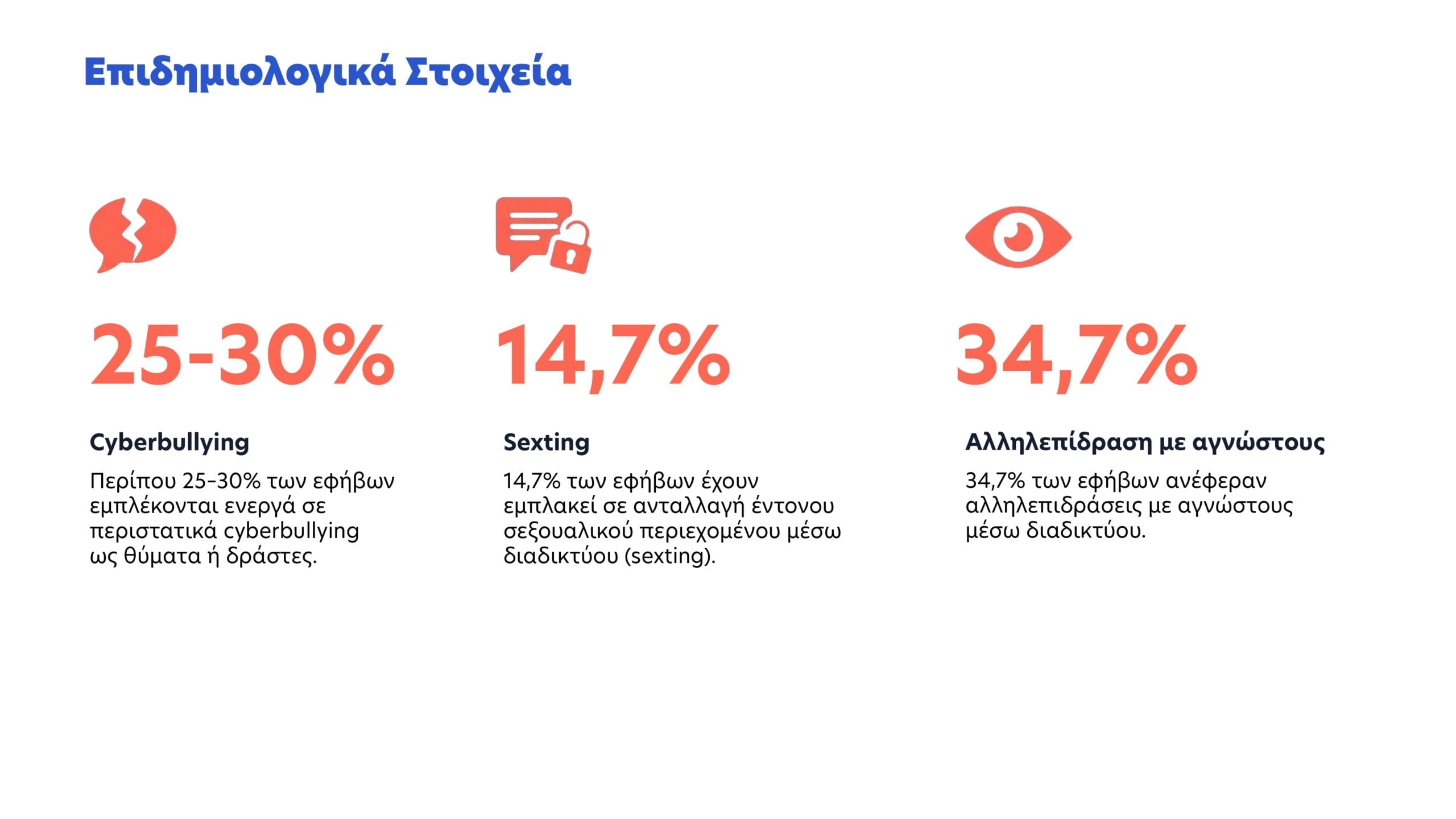 - 17% των παιδιών 11-15 ετών υπήρξαν θύματα διαδικτυακής παρενόχλησης (cyberbullying) την περίοδο 2021-2022.