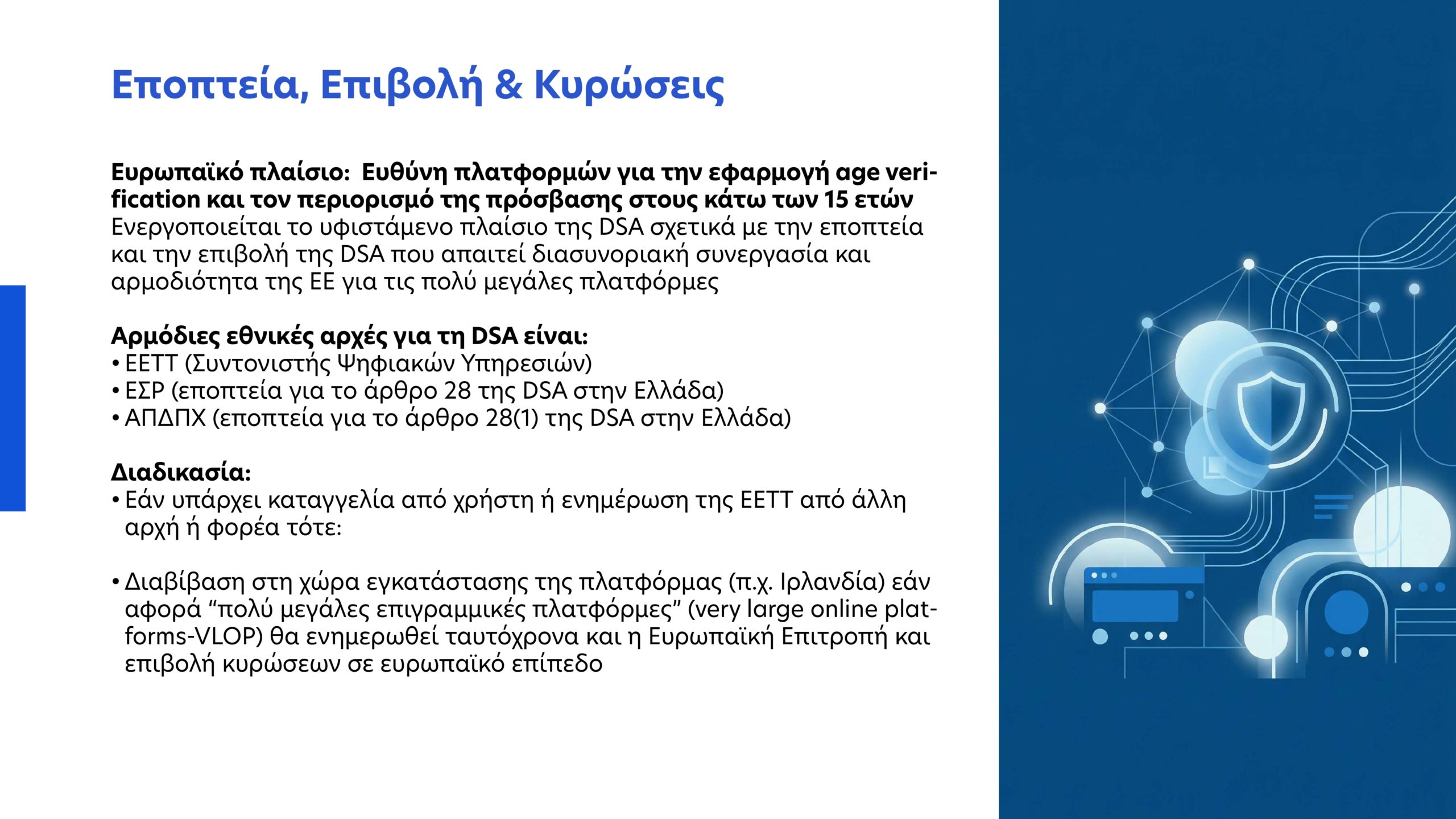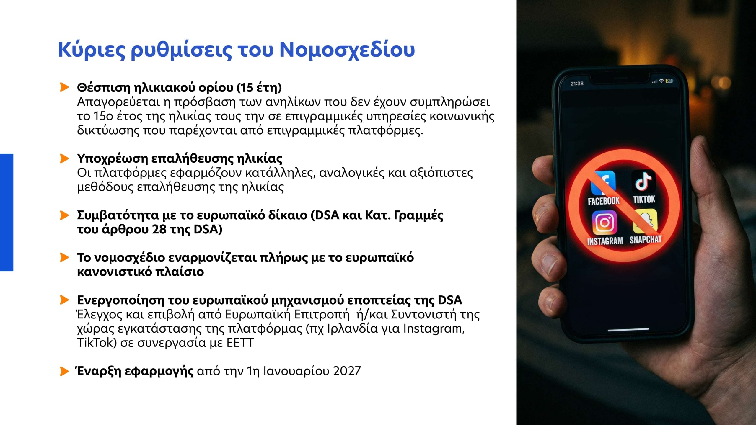 - Στην πράξη, την κύρια ευθύνη εφαρμογής την έχουν οι ίδιες οι πλατφόρμες, οι οποίες υποχρεούνται να εγκαταστήσουν αξιόπιστους μηχανισμούς επαλήθευσης ηλικίας και να μπλοκάρουν την πρόσβαση σε ανηλίκους κάτω του ορίου.
