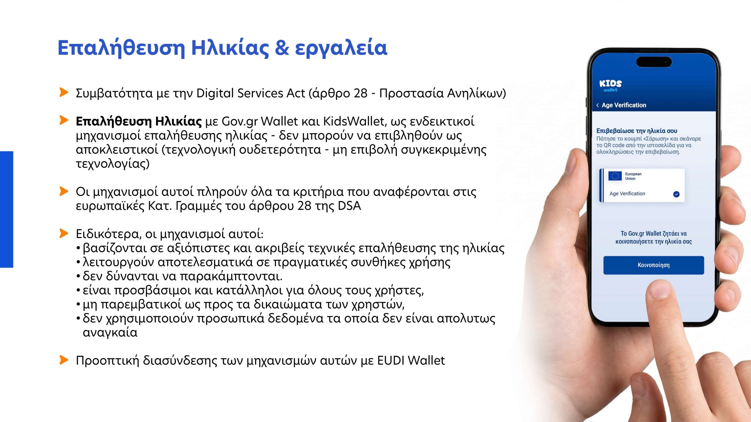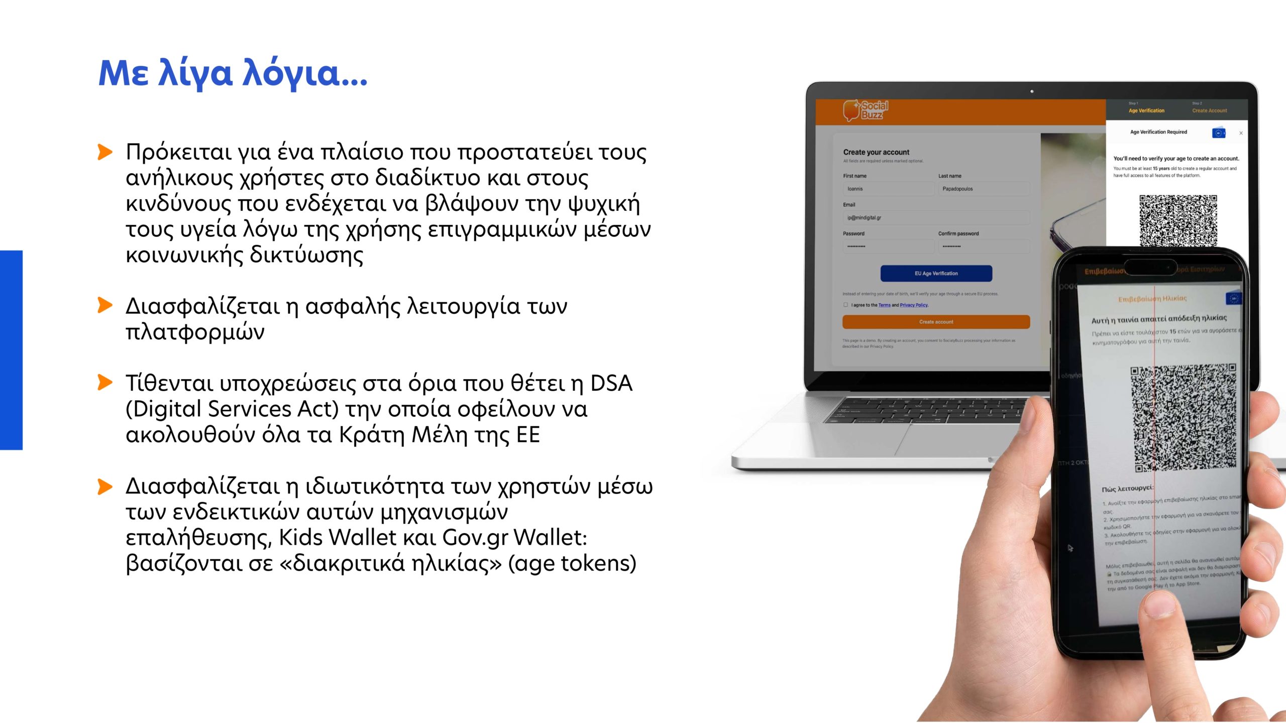 - Την υποχρεωτική χρήση του ενιαίου αυτού μηχανισμού επαλήθευσης ηλικίας από όλες τις πλατφόρμες που εξυπηρετούν χρήστες κάτω των 15 ετών.