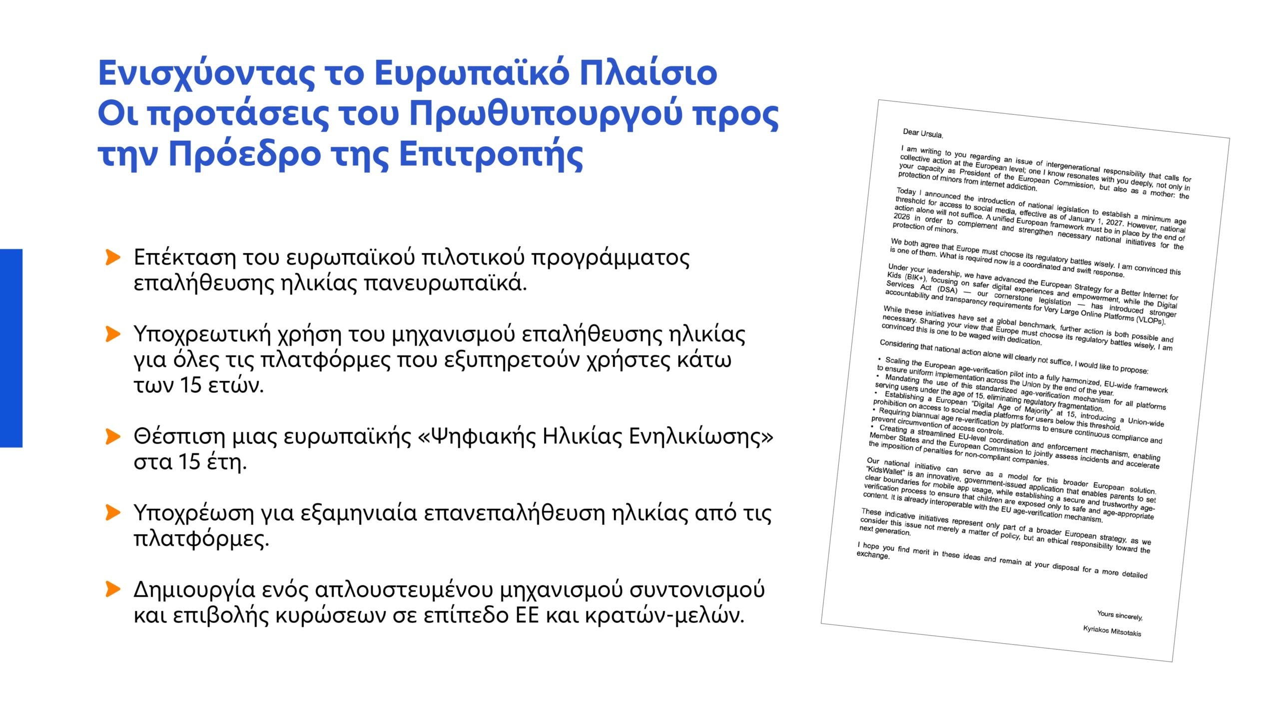 Αναγνωρίζοντας ότι το πλέγμα των ευρωπαϊκών ρυθμίσεων δεν είναι επαρκές για την προστασία των ανηλίκων από τον διαδικτυακό εθισμό, ο Έλληνας Πρωθυπουργός προχώρησε παράλληλα σε μια ανοικτή επιστολή προς την Πρόεδρο της Ευρωπαϊκής Επιτροπής, Ursula von der Leyen. Στην επιστολή αυτή ζητά άμεσα την υιοθέτηση μέτρων για την ουσιαστική προστασία των παιδιών μας.
