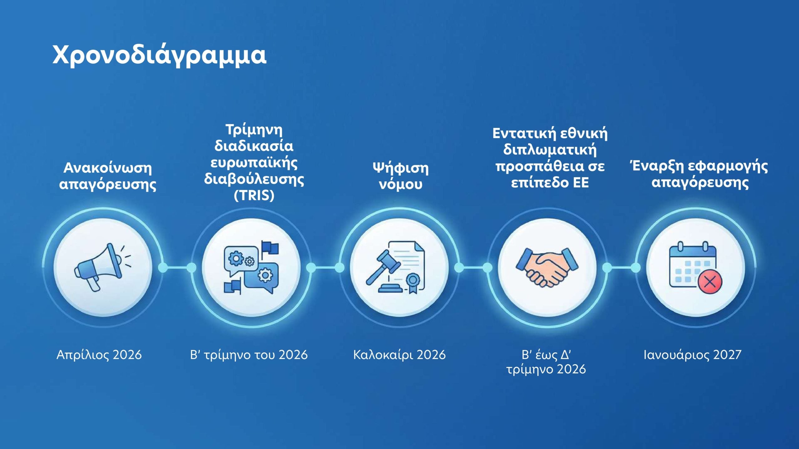 - Έναρξη εφαρμογής απαγόρευσης — Α’ τρίμηνο 2027