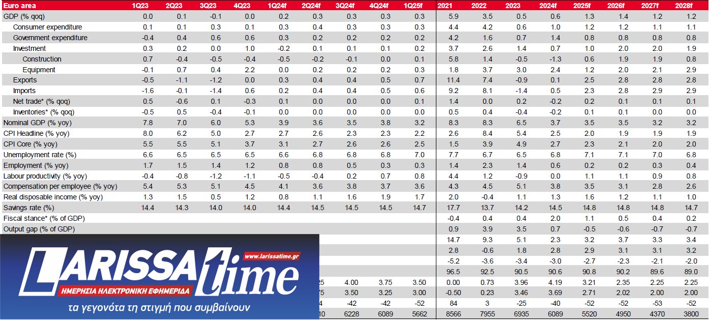 Αναφορικά με ολόκληρη την Ευρωζώνη, η Societe Generale, η αύξηση του ΑΕΠ ήταν ασθενής από το 4ο τρίμηνο του 2022, ενώ η απασχόληση παρέμεινε στάσιμη. Η γαλλική τράπεζα αναμένει παρόμοια υποτονική/υποδυνητική ανάπτυξη φέτος αλλά όχι (βαθιά) ύφεση. Οι προοπτικές για το 2025 θα εξαρτηθούν σε μεγάλο βαθμό από την έκταση της δημοσιονομικής σύσφιξης, η οποία έχει ήδη προγραμματιστεί να είναι σημαντική.