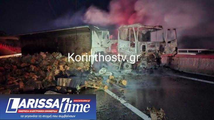 Η σύγκρουση ήταν τόσο ισχυρή που στο φορτηγό ξέσπασε φωτιά, σύμφωνα με το korinthostv.gr. Στο σημείο έφτασαν άμεσα οχήματα της Πυροσβεστικής, τα οποία κατάφεραν να θέσουν τη φωτιά υπό έλεγχο, ωστόσο η νταλίκα καταστράφηκε ολοσχερώς.