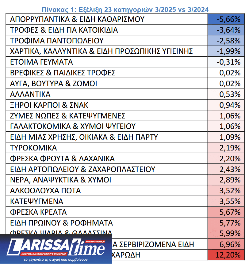 Οι μεγαλύτερες μειώσεις καταγράφηκαν στα απορρυπαντικά και είδη καθαρισμού, στις τροφές για κατοικίδια και στα τρόφιμα παντοπωλείου λόγω και της αποκλιμάκωσης της τιμής στο ελαιόλαδο.