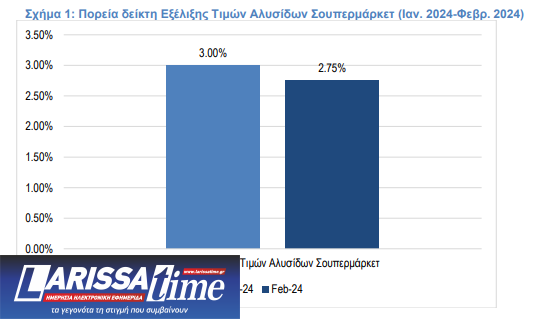 Η εμφανής συγκράτηση του δείκτη εξέλιξης τιμών αλυσίδων σουπερμάρκετ τον Φεβρουάριο 2024 δείχνει ότι ο πληθωρισμός στις αλυσίδες σουπερμάρκετ είναι της τάξης του 2,75%, έναντι 3,00% τον Ιανουάριο 2024.