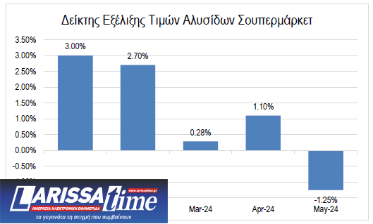 Η καθαρή μείωση του δείκτη εξέλιξης τιμών αλυσίδων σουπερμάρκετ τον Μάιο 2024 δείχνει ότι ο πληθωρισμός στις αλυσίδες σουπερμάρκετ είναι αρνητικός της τάξης του -1,25% (έναντι +1,10% τον Απρίλιο, +0,28% τον Μάρτιο, +2,70% τον Φεβρουάριο και +3,00% τον Ιανουάριο 2024).