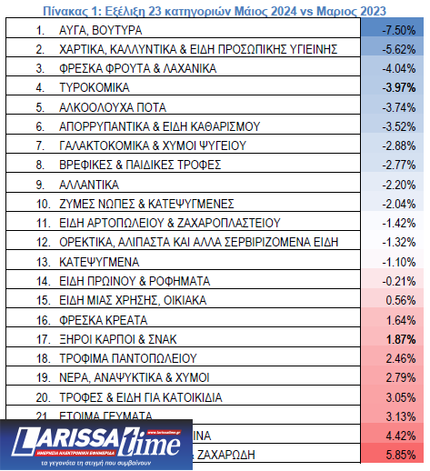 Η μεταβολή του Μαΐου σε σχέση με τον Απρίλιο οφείλεται κυρίως στη συνεχιζόμενη αποκλιμάκωση των τιμών και εν μέρει στην επίδραση της εποχικότητας λόγω Πάσχα, περίοδο κατά την οποία καταγράφονται έντονες προωθητικές ενέργειες την περίοδο της Μεγάλης Εβδομάδας, η οποία το 2023 ήταν στα μέσα Απριλίου, ενώ το 2024 στην πρώτη εβδομάδα του Μάϊου και ενσωματώνεται στα στοιχεία της παρούσας μέτρησης.