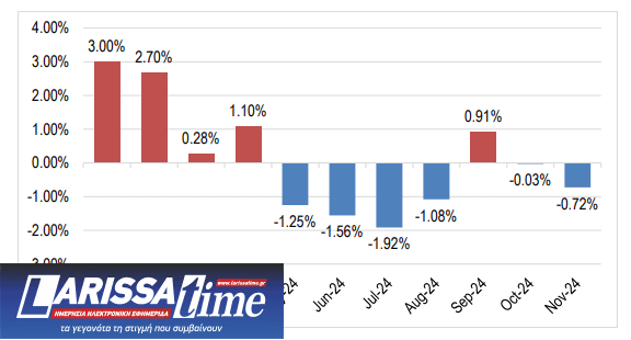 Η μεταβολή του Νοεμβρίου οφείλεται στις μειώσεις τόσο κατηγοριών μη τροφίμων, όσο και κατηγοριών τροφίμων, με μόνο πολύ συγκεκριμένες κατηγορίες να παρουσιάζουν αύξηση λόγω συγκυριακών συνθηκών, όπως κατηγορίες που σχετίζονται με το κακάο και τον καφέ και συγκεκριμένα νωπά είδη λόγω των κλιματικών συνθηκών.