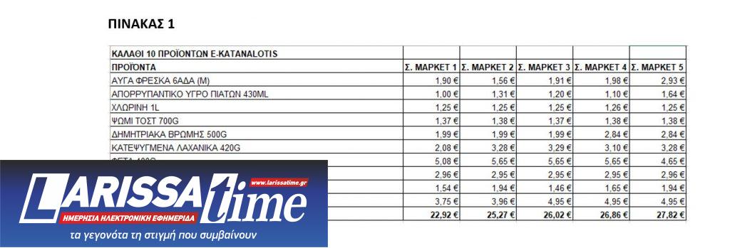 Στον πίνακα 1 της αναβαθμισμένης πλατφόρμας e-katanalotis παρακολουθούμε τη σύγκριση τιμών μεταξύ 5 διαφορετικών αλυσίδων σούπερ μάρκετ ενός καλαθιού που περιλαμβάνει τα ίδια ακριβώς 10 προϊόντα.