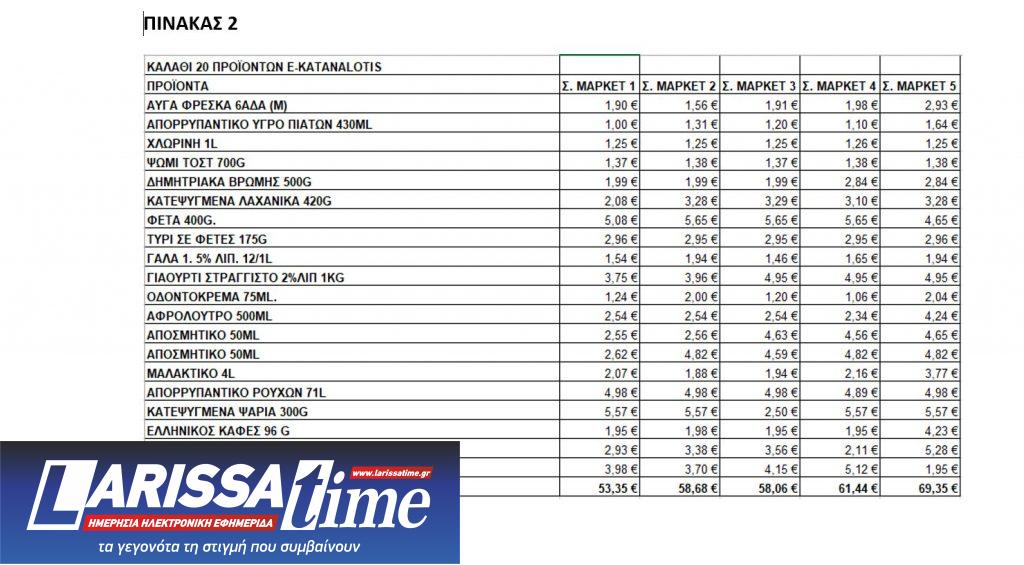 Στον πίνακα 2 της αναβαθμισμένης πλατφόρμας e-katanalotis παρακολουθούμε τη σύγκριση τιμών μεταξύ 5 διαφορετικών αλυσίδων ενός καλαθιού που περιλαμβάνει τα ίδια ακριβώς 20 προϊόντα.