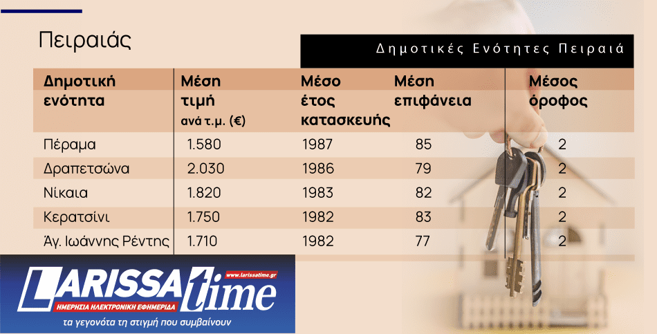 Στον Πειραιά, οι δημοτικές ενότητες με το νεότερο οικιστικό απόθεμα διαθέτουν κατοικίες με μέσο έτος κατασκευής από το 1982 έως το 1987, με τα πιο πρόσφατα ακίνητα να εντοπίζονται στο Πέραμα. Οι τιμές ανά τ.μ. κυμαίνονται από 1.580€ έως 2.030€, ενώ η μέση επιφάνεια των κατοικιών κυμαίνεται από 77 έως 85 τ.μ.. Οι περισσότερες κατοικίες βρίσκονται στον 2ο όροφο.