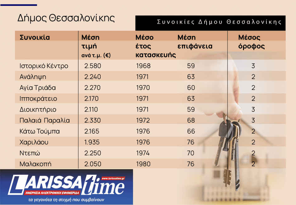 Στον Δήμο Θεσσαλονίκης, το μεγαλύτερο μέρος του διαθέσιμου οικιστικού αποθέματος προέρχεται από τη δεκαετία του 1970. Ωστόσο, υπάρχει διαφοροποίηση στη μέση επιφάνεια των κατοικιών, η οποία κυμαίνεται κυρίως μεταξύ 59 και 76 τ.μ. Οι τιμές ανά τ.μ. παρουσιάζουν διακυμάνσεις, με τις υψηλότερες στο Ιστορικό Κέντρο (2.580€/τ.μ.) και την Παλαιά Παραλία (2.330€/τ.μ.), ενώ πιο προσιτές επιλογές εντοπίζονται στη Χαριλάου (1.935€/τ.μ.). Ο μέσος όροφος κυμαίνεται κυρίως μεταξύ του 2ου και 3ου.