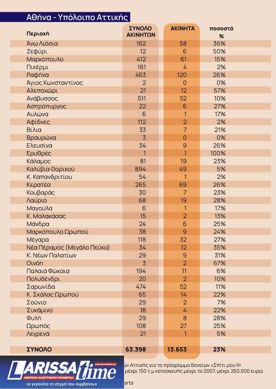 Στα νότια κυμαίνονται από το 6% στη Βάρη- Βάρκιζα έως το 29% και το 32% στην Καλλιθέα και τη Δάφνη, ενώ στα ανατολικά της Αττικής τα Σπάτα και η Αρτέμιδα έχουν ποσοστά διαθεσιμότητας στο 21%- 23%.