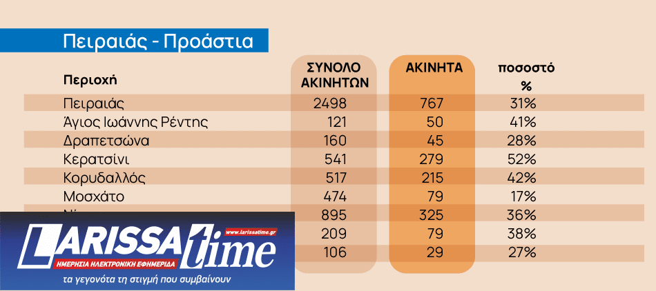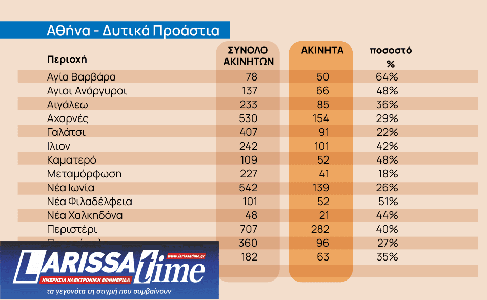 Οι δέκα περιοχές με τον μεγαλύτερο αριθμό διαθέσιμων ακινήτων είναι η Λεωφόρος Πατησίων-Αχαρνών (970 διαθέσιμα ακίνητα), ο Πειραιάς (767), η Γλυφάδα (548), η Καλλιθέα (533), η Κυψέλη (537), οι Αμπελόκηποι (469), το Παλαιό Φάληρο (331), η Νίκαια (325), το Παγκράτι (326) και η Νέα Σμύρνη (312).