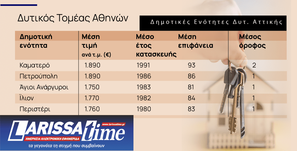 Στον Δυτικό Τομέα Αθηνών, οι δημοτικές ενότητες με το νεότερο οικιστικό απόθεμα διαθέτουν κατοικίες με μέσο έτος κατασκευής κυρίως τη δεκαετία του 1980, με τα πιο πρόσφατα ακίνητα να εντοπίζονται στο Καματερό το 1991. Οι τιμές ανά τ.μ. κυμαίνονται μεταξύ 1.750€ και 1.890€, ενώ η μέση επιφάνεια των κατοικιών κυμαίνεται από 81 έως 93 τ.μ.. και κυρίως στον 1ο όροφο.