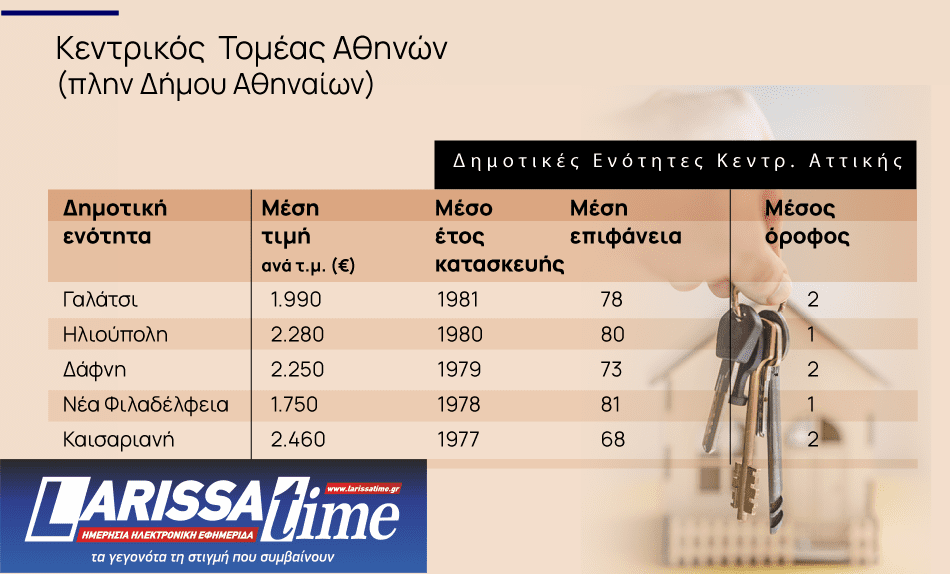 Στον Κεντρικό Τομέα Αθηνών, οι δημοτικές ενότητες με το νεότερο οικιστικό απόθεμα διαθέτουν κατοικίες με μέσο έτος κατασκευής από το 1977 έως το 1981, με τα πιο πρόσφατα ακίνητα να εντοπίζονται στο Γαλάτσι. Οι τιμές ανά τ.μ. κυμαίνονται από 1.750€ έως 2.460€, ενώ η μέση επιφάνεια των κατοικιών κυμαίνεται από 68 έως 81 τ.μ..