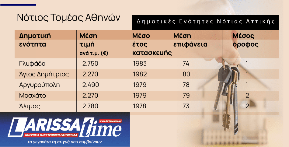 Στον Νότιο Τομέα Αθηνών, οι δημοτικές ενότητες με το νεότερο οικιστικό απόθεμα διαθέτουν κατοικίες με μέσο έτος κατασκευής από το 1978 έως το 1983, με τις πιο πρόσφατες να εντοπίζονται στη Γλυφάδα. Οι τιμές ανά τ.μ. κυμαίνονται από 2.270€ (έως 2.780€, ενώ η μέση επιφάνεια των κατοικιών κυμαίνεται από 73 έως 80 τ.μ..