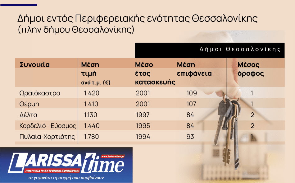 Στην Περιφερειακή Ενότητα Θεσσαλονίκης, οι δήμοι με το νεότερο οικιστικό απόθεμα διαθέτουν κατοικίες με μέσο έτος κατασκευής από το 1994 έως το 2001, με τα πιο πρόσφατα ακίνητα να εντοπίζονται στο Ωραιόκαστρο και τη Θέρμη. Οι τιμές ανά τ.μ. κυμαίνονται από 1.130€ έως 1.780€, ενώ η μέση επιφάνεια των κατοικιών κυμαίνεται από 84 έως 109 τ.μ., με τα μεγαλύτερα ακίνητα να βρίσκονται στο Ωραιόκαστρο.