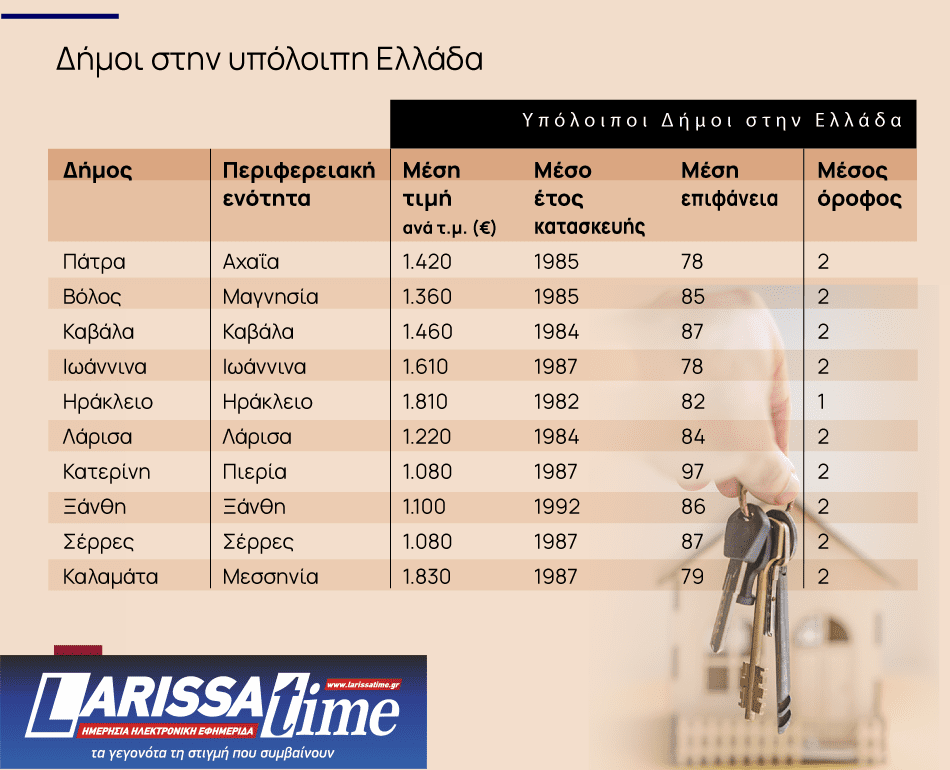 Οι ενδεικτικοί δήμοι στην υπόλοιπη Ελλάδα διαθέτουν κατοικίες με μέσο έτος κατασκευής από το 1982 έως το 1992, με τα νεότερα ακίνητα να εντοπίζονται στην Ξάνθη (1992). Οι τιμές ανά τ.μ. κυμαίνονται από 1.080€ (Κατερίνη, Σέρρες) έως 1.830€ (Καλαμάτα), ενώ η μέση επιφάνεια των κατοικιών κυμαίνεται μεταξύ 78 και 97 τ.μ., με τα μεγαλύτερα ακίνητα να βρίσκονται στην Κατερίνη.