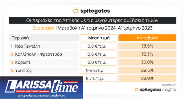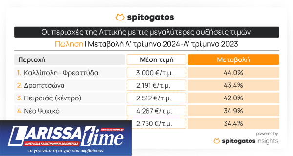 Στις πρώτες θέσεις της λίστας των περιοχών με τις υψηλότερες αυξήσεις της μέσης ζητούμενης τιμής πώλησης κατοικίας στην Αττική εμφανίζονται οι περιοχές του Πειραιά όπως η Καλλίπολη- Φρεαττύδα, η Δραπετσώνα και το κέντρο του Πειραιά. Ακολουθεί το Νέο Ψυχικό, όπου σημειώθηκε αύξηση 34,9% στη μέση ζητούμενη τιμή πώλησης κατοικίας, και τέλος η Παλλήνη οπού σημειώθηκε αύξηση 34,4%. Στη Θεσσαλονίκη, η περιοχή Χαριλάου (2.538 ευρώ/τ.μ.), η Άνω Πόλη (1.849 €/τ.μ.) και η περιοχή Πεύκα (1.714 €/τ.μ.) βρέθηκαν στις top περιοχές με τις μεγαλύτερες αυξήσεις μέσης ζητούμενης τιμή πώλησης κατοικίας το πρώτο τρίμηνο του 2024. ![]()