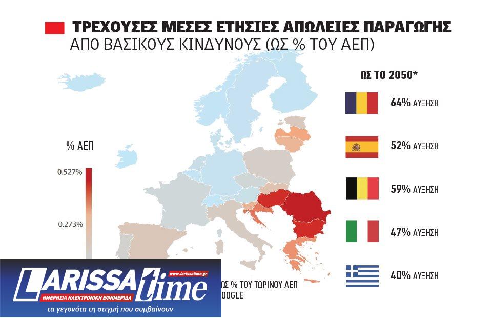 - Μέχρι το 2050, οι συνολικές ακραίες απώλειες στην ΕΕ προβλέπεται να αυξηθούν κατά 50%, ήτοι πάνω >90 δισ. ευρώ. H µέση ετήσια ζηµία υπολογίζεται σε >40 δισ. ευρώ