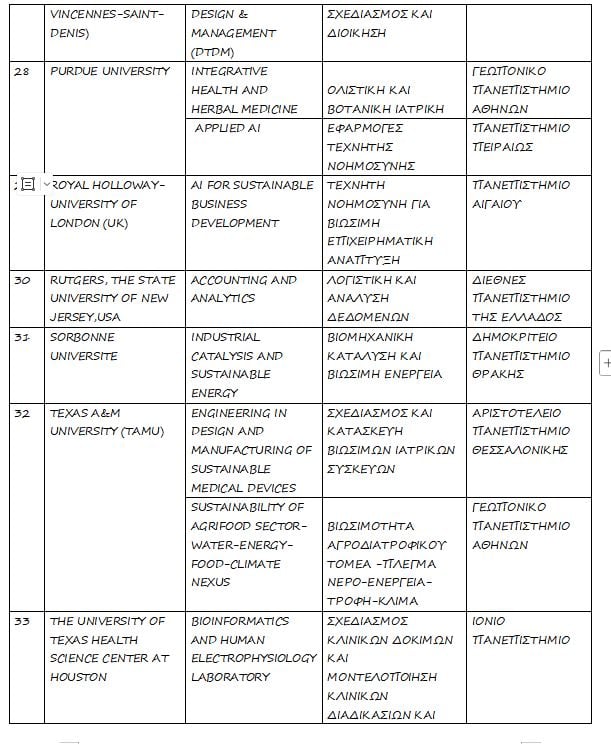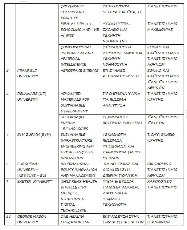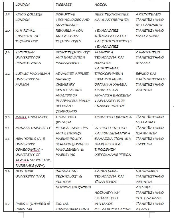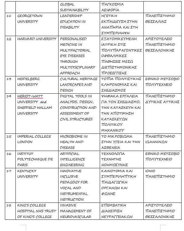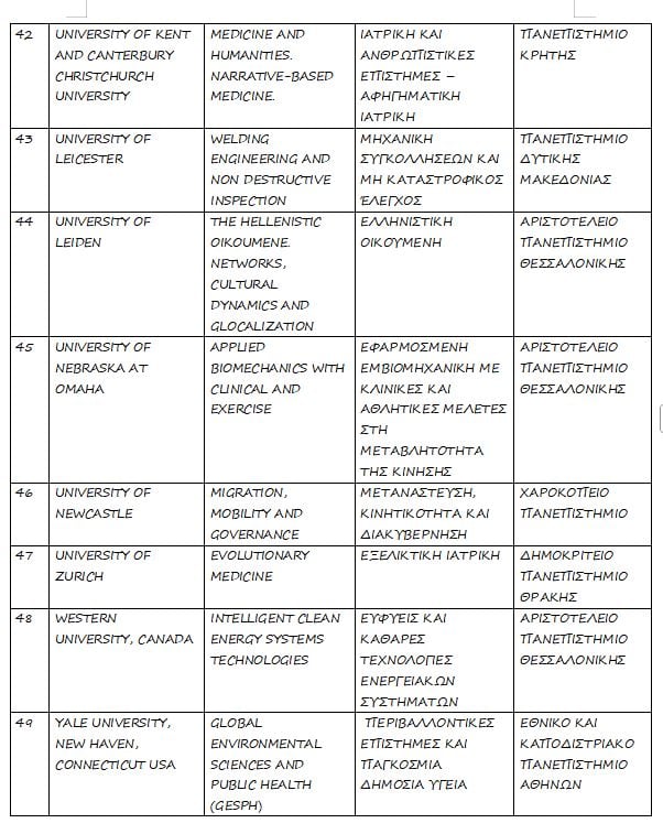 Παράλληλα, ανέφερε ότι έχουν κατατεθεί 132 προτάσεις από πανεπιστήμια του εξωτερικού για συνεργασίες με δημόσια ελληνικά πανεπιστήμια. Μεταξύ αυτών συγκαταλέγονται κορυφαία ιδρύματα, όπως το Harvard, το Yale, το Columbia, το Imperial College και το Πανεπιστήμιο της Βοστώνης, γεγονός που σύμφωνα με την ηγεσία του υπουργείου Παιδείας, επιβεβαιώνει τη διεθνή απήχηση των ελληνικών ΑΕΙ. Πρόκειται για αιτήσεις σχετικά με κοινά μεταπτυχιακά προγράμματα με τμήματα πανεπιστημίων της χώρας.