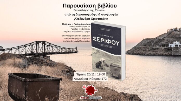Η Λέσχη Εργαζομένων και Νεολαίας Ελληνικού -Αργυρούπολης παρουσιάζει την Πέμπτη 20 Νοεμβρίου 2025 στις 7μμ το βιβλίο «Στα σπλάχνα της Σερίφου», εκδόσεις «Πυξίδα της Πόλης».